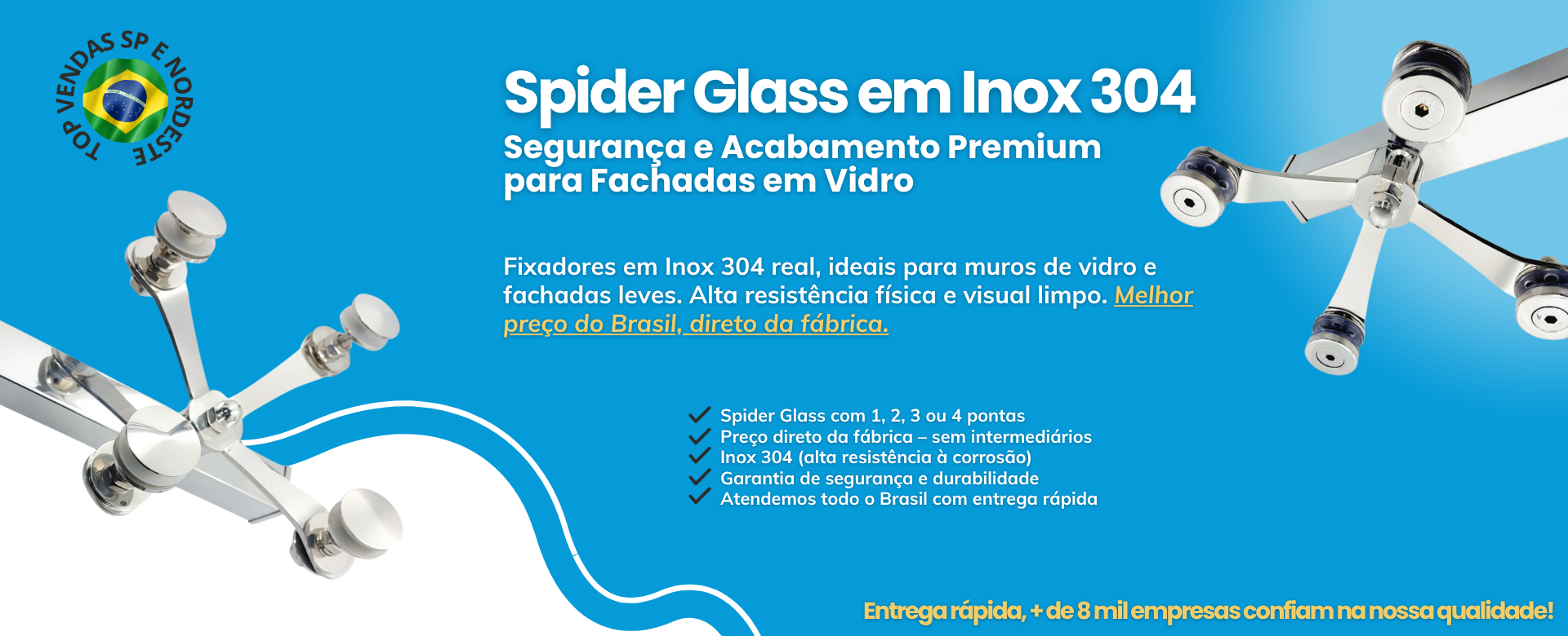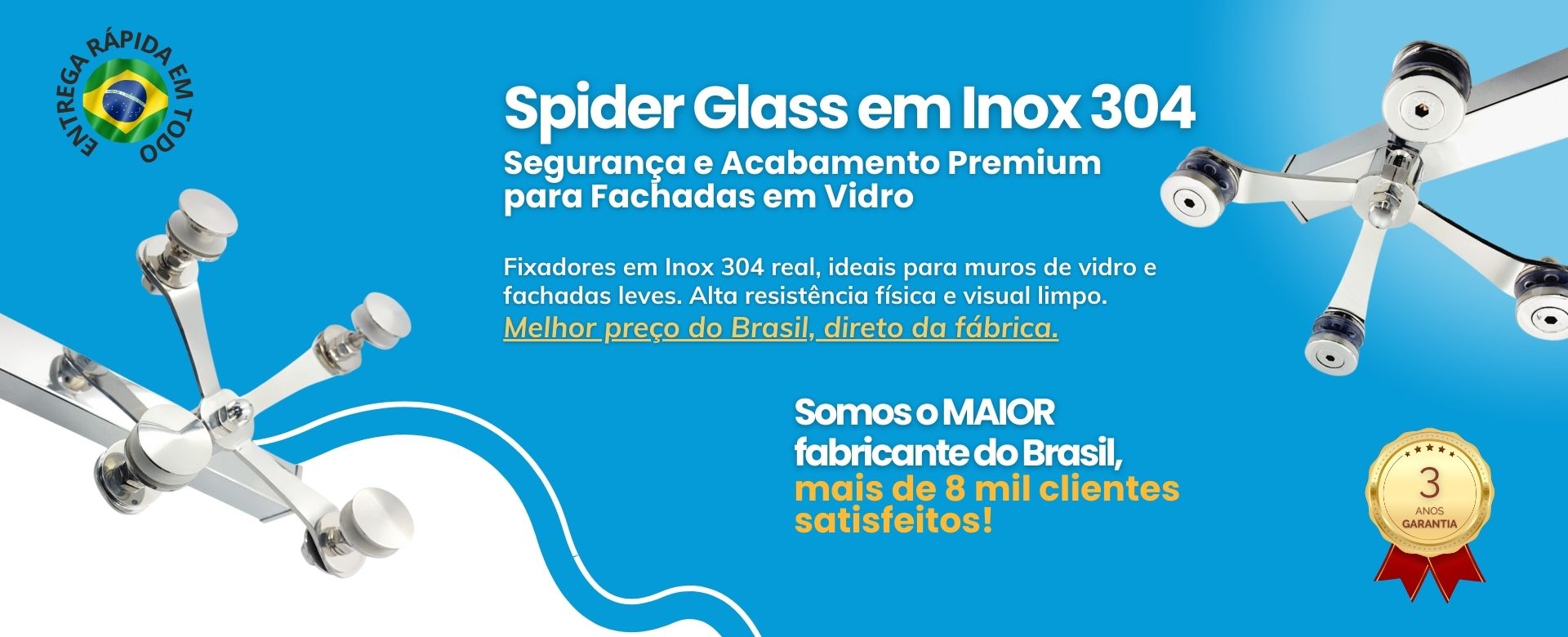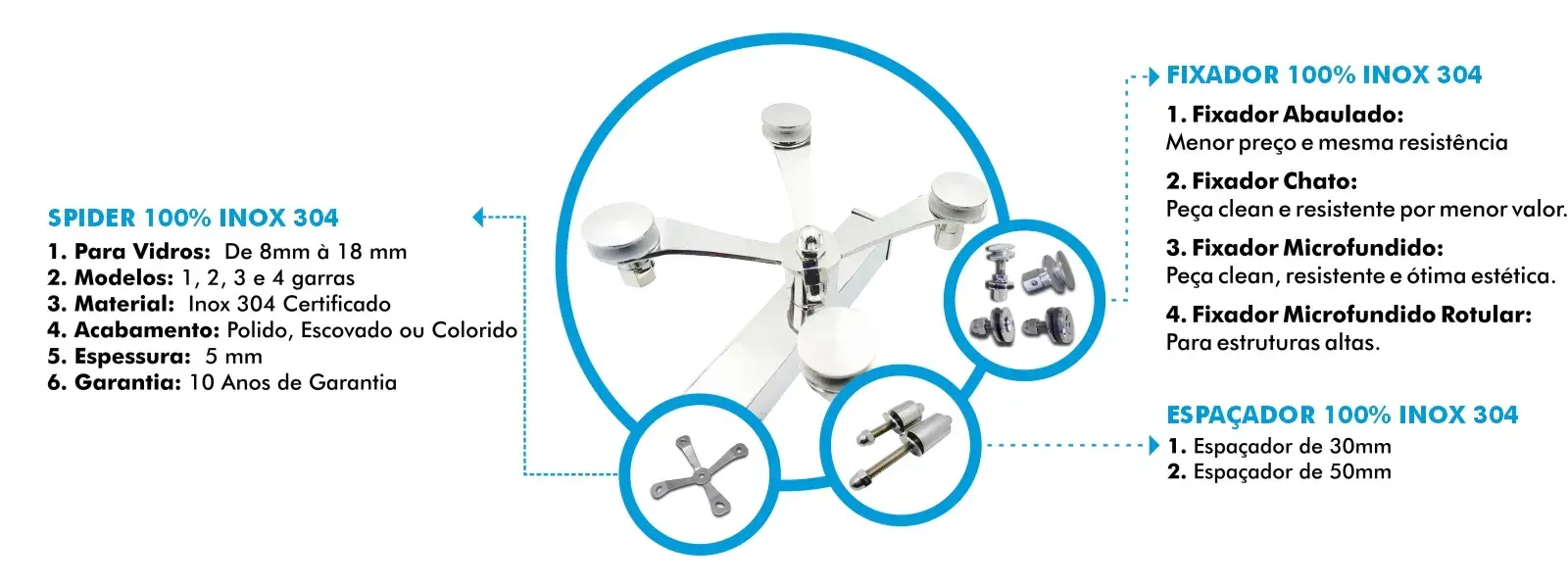 Tenha total segurança em sua estrutura de vidro com o uso desse spider glass de inox 304 para vidro, pois este é um material de alta resistência à corrosão e também a esforços físicos.
