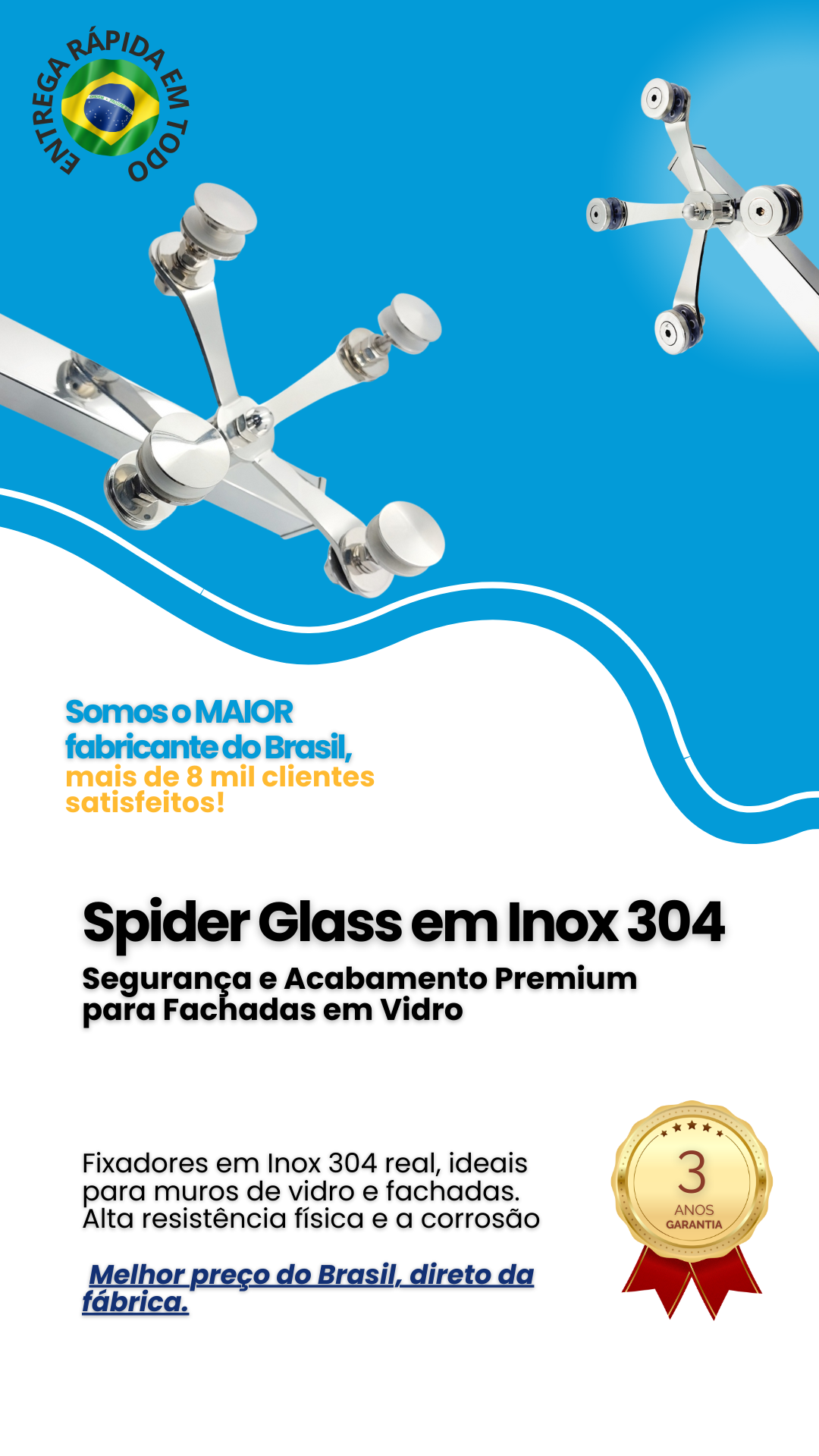 Garantia de 3 anos do Inox 304, desde que não submetido a produtos ácidos e corrosivos.
